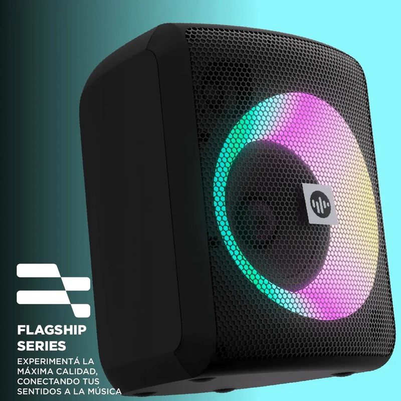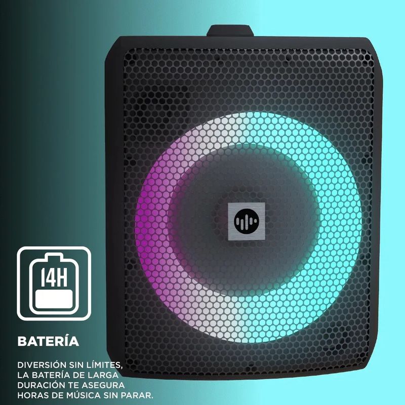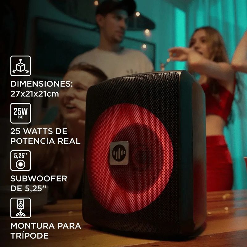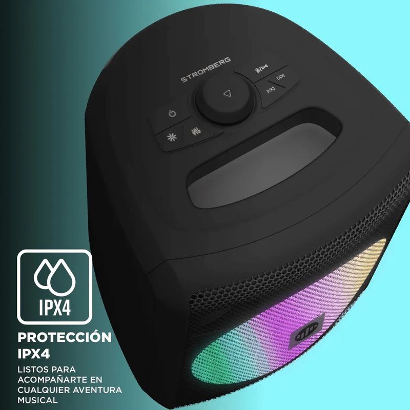 Incluye luces RGB rítmicas, certificación IPX4 contra salpicaduras y entrada para micrófono con volumen independiente para función karaoke.