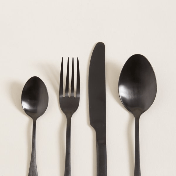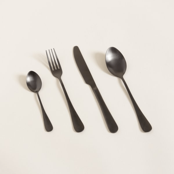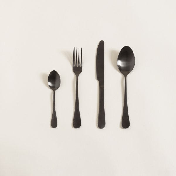 Descripción | Piezas: 16 - Set de cubiertos de color negro que aportan versatilidad y elegancia. Su notable material de acero inoxidable hacen del set resistente y duradero. Diseño sofisticado y estilo moderno. |